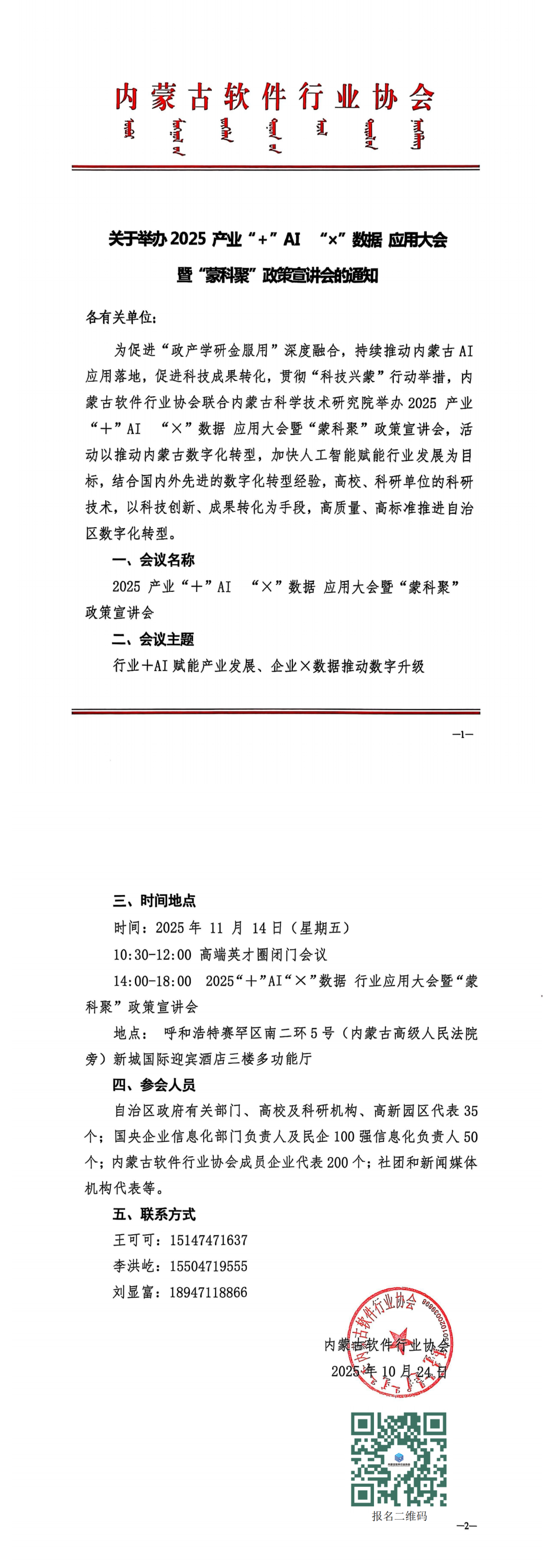 关于举办 2025 产业“+”AI “x”数据 应用大会暨“蒙科聚”政策宣讲会的通知